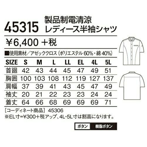 自重堂 作業服 45315 レディース半袖シャツ 春夏 レディース 作業着 半袖 ワークウエア ワークシャツ