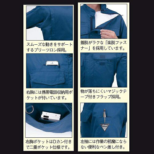 スタンドカラーのスタイリッシュなデザインプリーツロン+XEカットで動きやすさ抜群のツナギに肌触りのいい上質ハイブリッドコットンを使用!