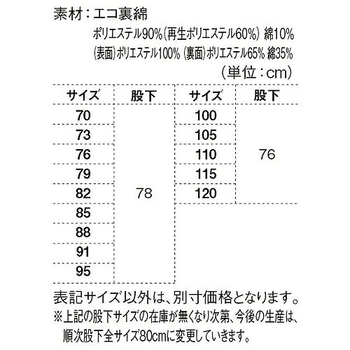 ※画像サイズ表に記載している股下サイズの製品在庫がなくなり次第、今後の生産製品は、順次全サイズ股下80cmとなり、品番の末に[E]の文字が入ります。
