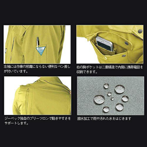 再生ポリエステルを使ったエコ生地の柔らかな着心地が特徴のワークウェア。ブルゾン・シャツともに男っぽくシンプルにまとめたデザインに、動きやすいプリーツロンを採用。帯電防止加工も施され、建築・土木などを中心にハードな現場に人気です。