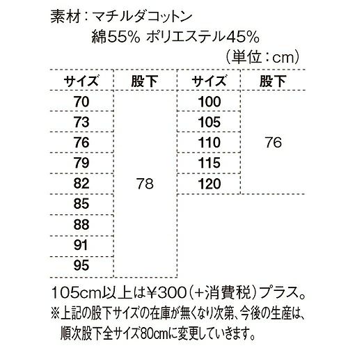 ※画像サイズ表に記載している股下サイズの製品在庫がなくなり次第、今後の生産製品は、順次全サイズ股下80cmとなり、品番の末に[E]の文字が入ります。