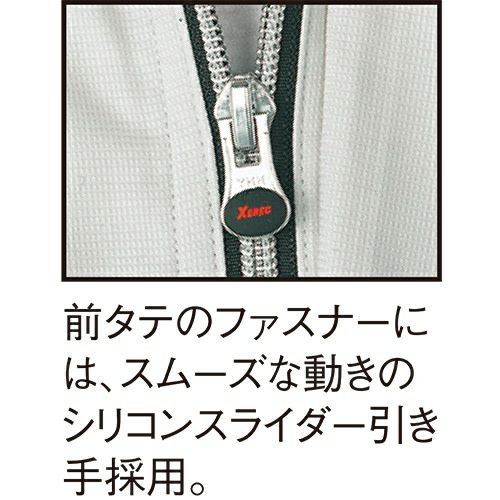 非対称デザインの胸ポケットがオシャレ度をアップ。通気性の良い校倉造り構造素材+脇下メッシュ素材で軽快に。脇下に施した特殊カッティングが背中のプリーツと連動して滑らかな腕の動きをサポートするスムーズアップ機能装着。土木・建築から運送・工場と幅広い職場に対応します。