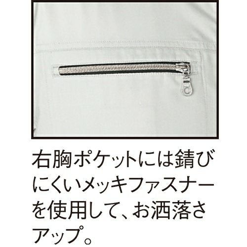 非対称デザインの胸ポケットがオシャレ度をアップ。通気性の良い校倉造り構造素材+脇下メッシュ素材で軽快に。脇下に施した特殊カッティングが背中のプリーツと連動して滑らかな腕の動きをサポートするスムーズアップ機能装着。土木・建築から運送・工場と幅広い職場に対応します。