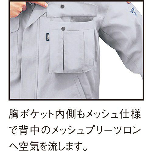 ガーゼのような風合いの生地「スーパークールグログラン」に「エアストリームシステム」をプラスした清涼作業服。吸汗性・速乾性・通気性とも最高レベルの爽やかな着心地で熱中症対策にも最適の清涼感あふれる作業服です。