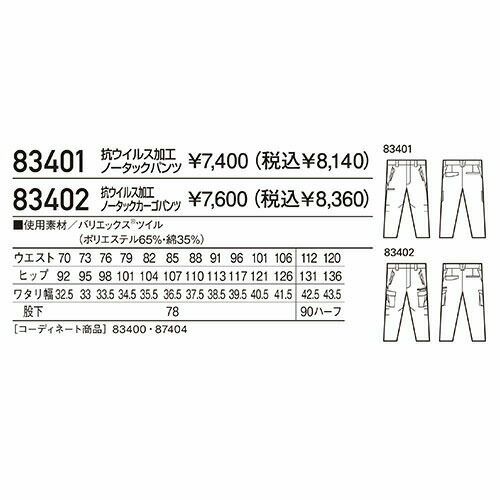 他の画像を見る 作業服 レディース パンツ 自重堂 Field Message 抗ウイルス加工レディースパンツ 83406 作業着 通年 秋冬 帯電防止 抗ウイルス 抗菌防臭 男女共用 特別価格 ¥ 4,389 税込 〜 特別価格 ¥ 税込 抗ウイルス加工素材「バリエックス(R)」を使用した安全・安心の男女ペアユニフォーム 詳細を見る お気に入りに登録する