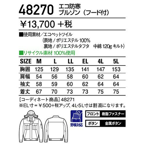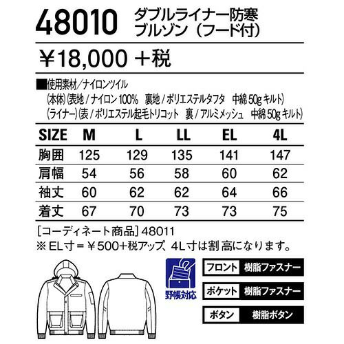 他の画像を見る 自重堂 ブルゾン(フード付) 防寒ジャケット ドカジャン 保温 人気 安い ダウン 防寒着 防寒ジャンパー 上着 ブルゾン 最強 アウター おしゃれ 暖かい 秋冬 かっこいい 作業着 ワーク マン メンズ 寒さ対策 屋内作業 屋外作業 あったか 防寒グッズ 48010 特別価格 ¥ 10,703 税込 〜 特別価格 ¥ 税込 アルミメタシートで最強の保温効果。 魔法瓶効果で、熱をウエアの外に逃さない軽くて温かい「アルミメタシート」を採用。 優れた撥水・撥油性を発揮する高性能な防寒ウエア。 在庫切れ 詳細を見る お気に入りに登録する