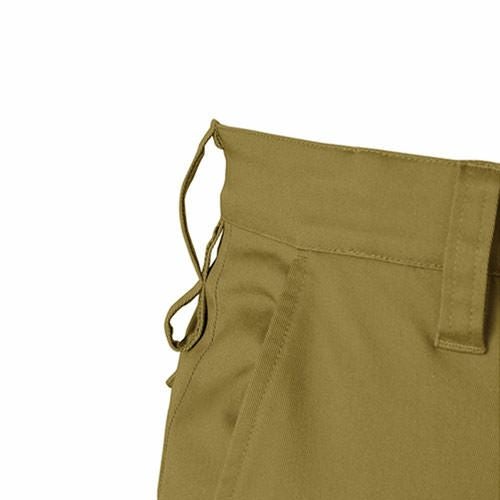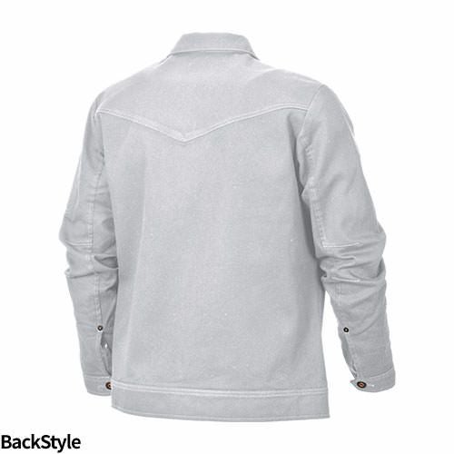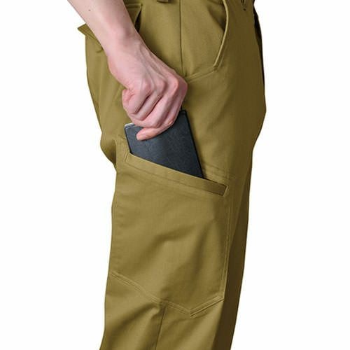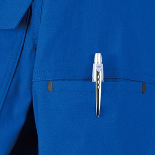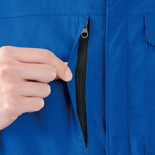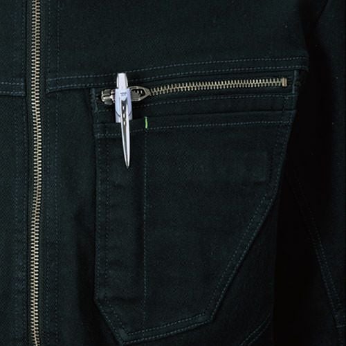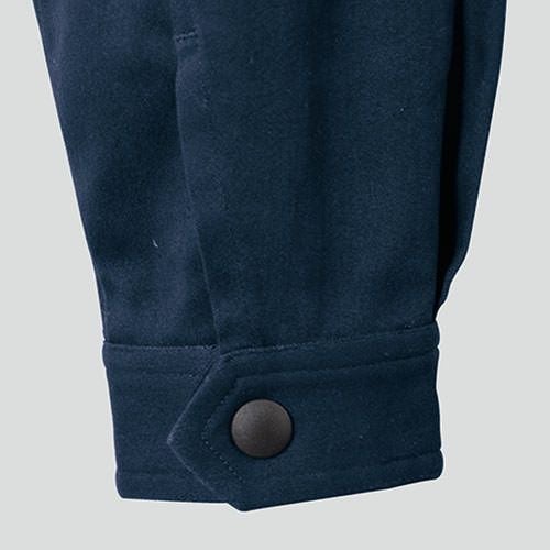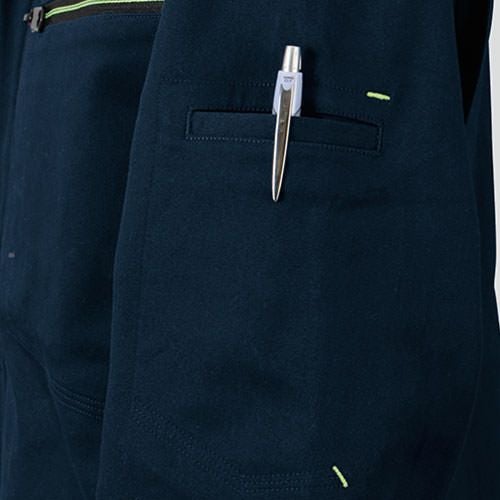 ストレッチ性を付与した制電対応綿素材 ストレッチ素材を活かし、定番スタイルながら野暮ったさを払拭、制電糸を使用し、大型ポケットを設けることで多様な用途に対応