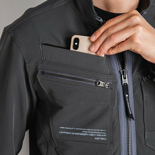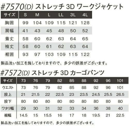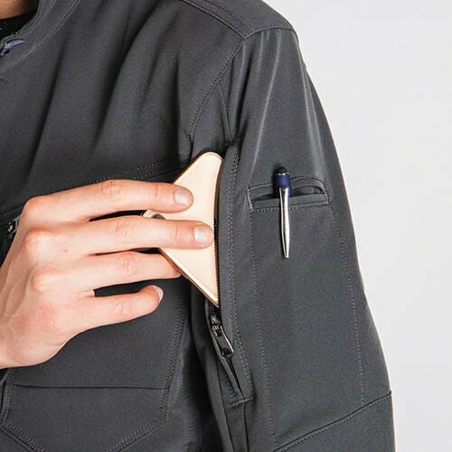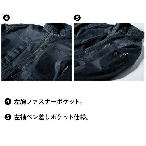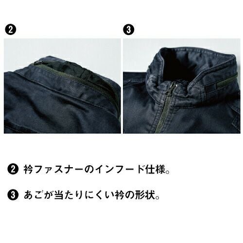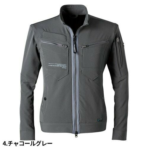 世界を席巻するナイロンスパンデックス素材が更なるボリュームアップを実現。近未来系ワークウェア、ここに極まる。 ・アウトドアやスポーツシーンで幅広く使用されている高性能ナイロンストレッチ素材を、よりハードワーク仕様に改良したヘビーディーティーユースモデル。特殊な織り構造により、従来商品に比べ生地の大幅な目付アップを実現。デザインも一新しハードワーカー様等幅広い業種に対応可能。・細番手のナイロン糸を高密度に織り込む事で高い堅牢性を実現。素材裏面は点接触構造で高級感溢れる着用感。・現在のスポーツ業界で主流となっているタテ方向の伸びを強調(伸長率タテ約42%、ヨコ約23%)した全方位ストレッチで、驚異の動き易さを実現(伸長回復率は1時間後タテ約88%、ヨコ約80%)。・生地の性能だけでなく、3Dパターンを取り入れ更なる動き易さアップ。・プラスティック製のファスナー、金属製のドット釦等は国産YKK社製を使用。細部にまで品質に拘っています。