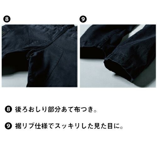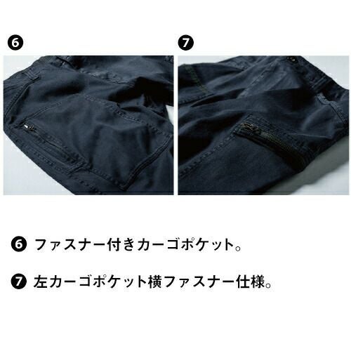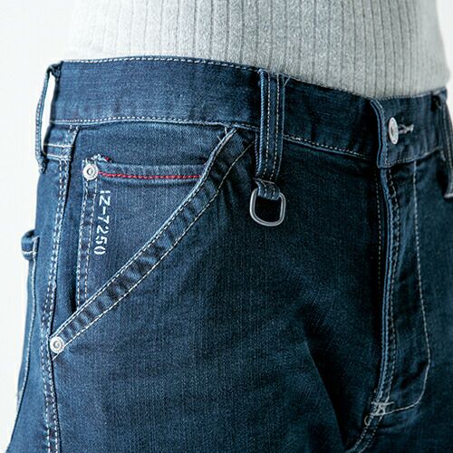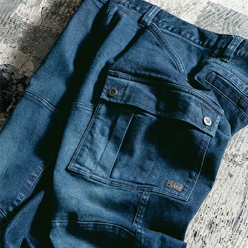 Will be Reborn. アイズ伝説的モデルを鮮やかにアップデート。全ての機能を一新し、ストレッチデニムの新たな歩みがここから始まる。 ・ストレッチデニムワークウェア#7250シリーズの後継モデル。全ての機能をバージョンアップし、カーゴパンツのシルエットも現代に合わせスタイリッシュにアップデート。・伸長率ヨコ約48%、伸長回復率1時間後約92%を誇るハイレベルなデニム素材を使用。ストレスのない快適な動き易さと、安定感のあるスタイリッシュなスタイルキープを実現。・生地の性能だけでなく、3Dパターンを取り入れ更なる動き易さアップ。・現代のトレンド感を加えたややポップなデザイン性と、ワークウェアとして充分に機能する高い収納性を両立。・金属製のファスナー、ドット釦等は国産YKK社製を使用。細部にまで品質に拘っています。