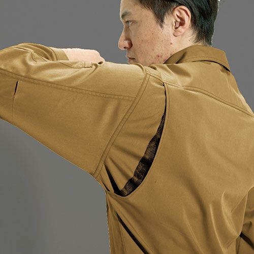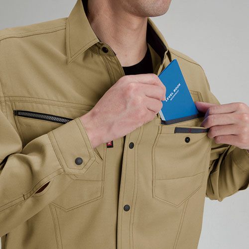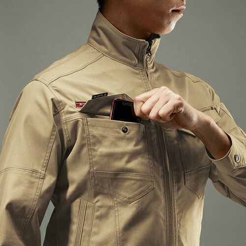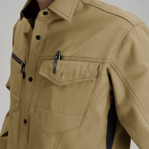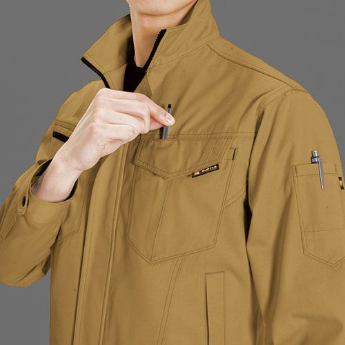アクションタックの動きやすさに魅力の収納力ミリタリーワーク 肌ざわりのいいピーチ素材に抗菌防臭・帯電防止加工、ヒジやヒザの動きをスムーズにするアクションタックを採用した高機能ウェアに配された、使い勝手のいいたくさんのポケットの存在がさらに機能性を高めています。