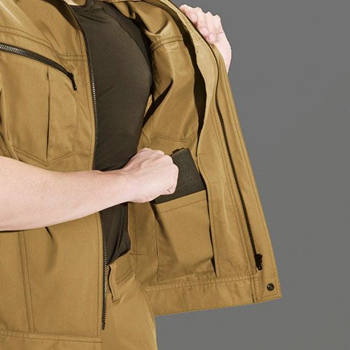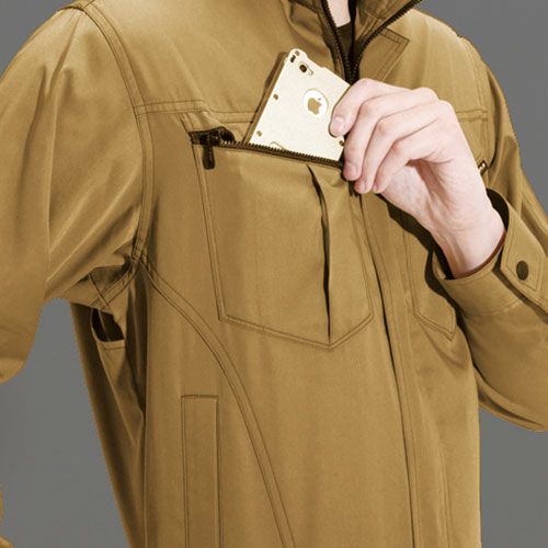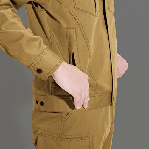 ミリタリーデザインがカッコイイ綿100%ワークウェア 付属は全て丈夫な金属製。ボタンは隠し仕様で物を傷つけにくく、火を扱う現場にも対応。ファスナーやポケットなど収納も充実しています。
