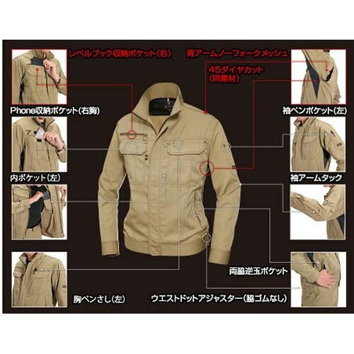 男女ともにクールに着こなす! 清涼素材仕立てスタイリッシュデザイン高品質な日本製ドビークロス(校倉構造)点接触清涼素材を使用優れた通気性に汗のべたつきを解消(COOL BIZ対応商品)レベルブックが入る大型マルチポケット付製品制電JIS T8118適合品腕の上げ下げがスムーズな独自の脇ダイヤカット