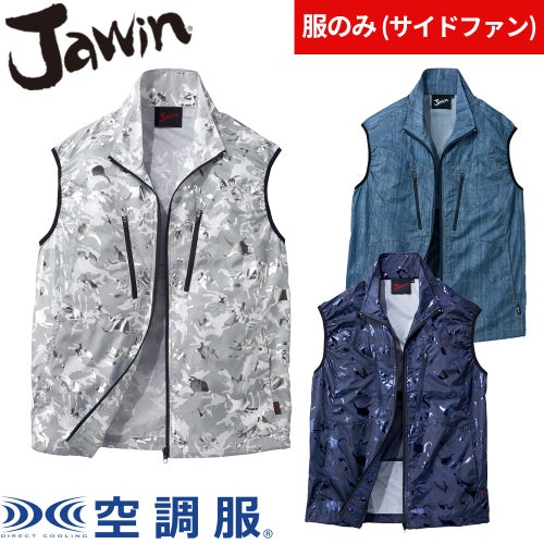 存在感際立つ空調服ジャケット 光沢感のあるカモフラ柄とデニム柄をプリントしたカジュアルテイスト空調服 ポリエステル100%ベストタイプ。