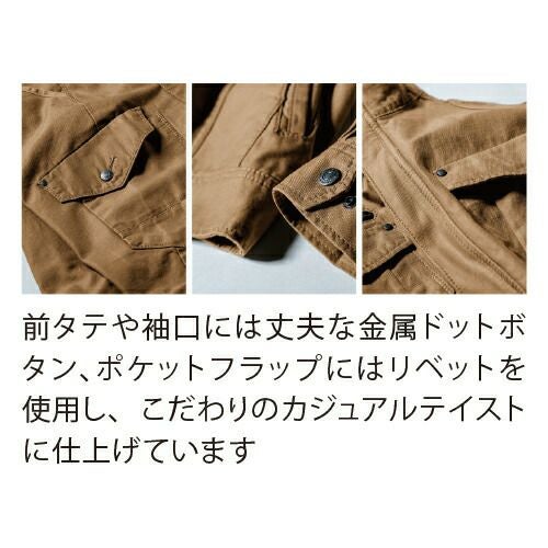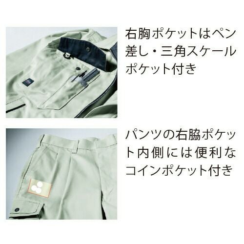 進化形作業服 ミニハイブリッドブルゾン(1260)&ミニハイブリッドスラックス(1262)のお得な上下セット!! ハイブリッドコットン使用の進化形作業服!上質ハイブリッドコットンのソフトな風合いに、シンプルデザインとミリタリーテイストのカラーが醸し出す精悍な男っぽさで人気の定番シリーズ。二重ポケット仕様の胸のフラップポケットをはじめ、機能性と収納性に優れた多彩なポケットが作業現場をサポート。上下セットでご入用の方には必見!
