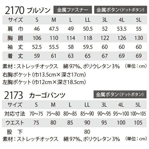 大人気ZIP現場服 ストレッチブルゾン(2170)&ZIP現場服 ストレッチカーゴパンツ(2173)のお得な上下セット!! 動きやすさを極めたワンランク上の現場服着易さ・機能性にこだわり抜いた新感覚ユニフォーム立体設計と着心地のよいストレッチ素材が動き易さをサポート!バイオウォッシュ加工でソフトな手触り