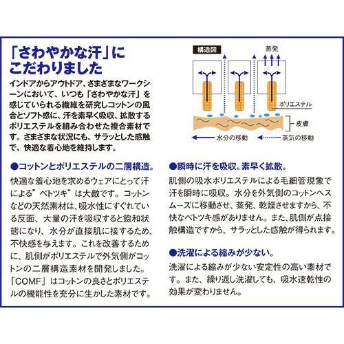 激涼クールボディ! 優しく柔らかな風合いのコットンと汗の吸収・拡散に優れたポリエステルの二重構造という新素材の採用でサラッとした爽やかな着心地を実現。「さわやかな汗」にこだわったクール&ドライの着心地で炎天下でのハードワークから工場作業までサポートします。
