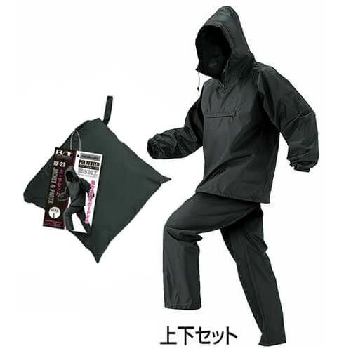 工場・工事現場・林業・農作業など、ハードで厳しい環境での使用に最適な高機能レインジャケット 通常のフードとヘルメットフード(前方に張り出したひさし付き)の二つを装備手袋使用を前提に、20mmの平ゴムでフィットする二重袖口を採用裏面はベトツキを緩和する全面平織り繊維貼り背中には夜間の視認性を高める反射テープ付き左胸には小物の収納に便利なポケットと、視認性を高める反射ワッペン付き合わせには折り返しが付いた「逆水止め」採用で、風雨の侵入を防止