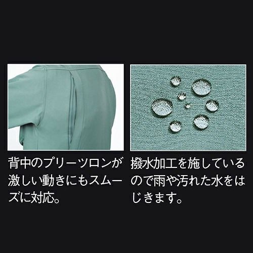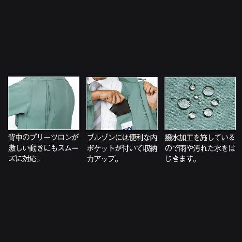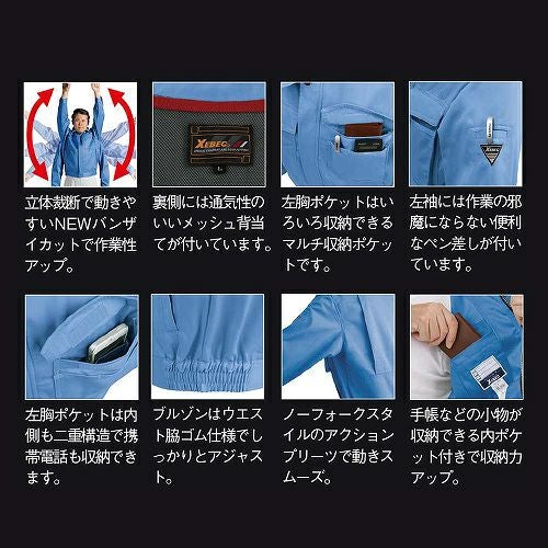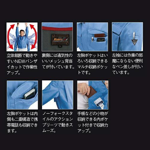 上下ともに非対称なポケットデザインの お洒落作業服 左胸ポケットのスリットに反射材を配したお洒落な作業服に、脇下のXEカットと背中のプリーツロンが連動して滑らかな動きをサポートするスムーズアップ機能を装着。お洒落さと動きやすさで、土木・建築から運送・工場と幅広い職場に対応します。