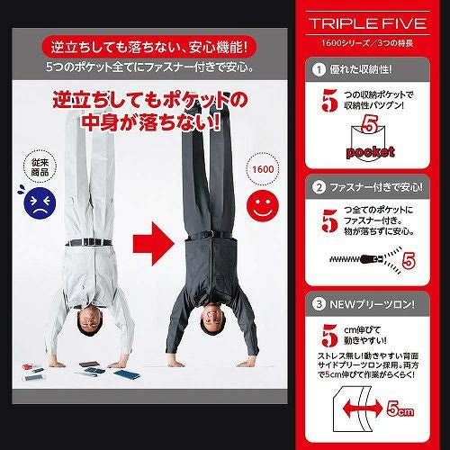 逆立ちしても物が落ちない! 立体裁断で腕の動きをスムーズにするNEWバンザイカットに、さらに動きやすく進化したNEWプリーツロンを採用。落下の心配がないファスナー付き5ポケット仕様で収納力もアップして、タフな現場から工場作業までオールマイティーにサポートします。