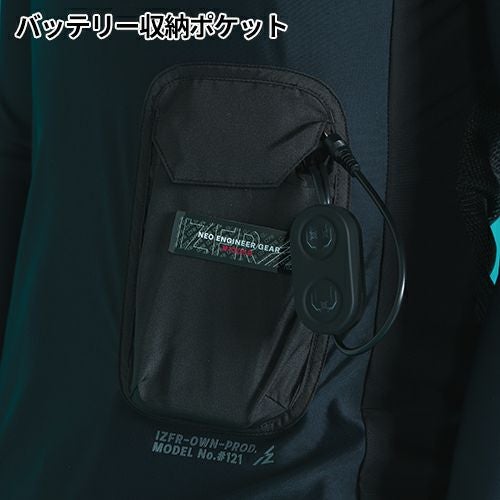 それは例えるなら氷を纏う。テクノロジーの進化が行きつく新たなる可能性。全てのワークシーン待望のニュータイプアイシングユニフォーム。 ペルチェデバイスが装着可能なニュータイプ冷却ウェア。後ろ襟首と背面両脇の計6か所に直径5cmのペルチェデバイスが装着可能な#121ジップアップタイプ。デバイス接触部位は電源を入れ約10秒で環境温度より最大マイナス約25℃のハイレベルな冷却機能を発揮。動脈を冷やすことにより効果的に体全体をクールダウンさせ、猛暑時の疲労軽減を促します。
