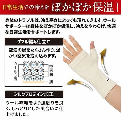 日常生活での冷えをぽかぽか保温! 高品質メリノウールを使用した秋冬向けサポーター 高品質メリノウール100%で肌に優しくあたたかい保湿効果で手のひらが冷えにくい。防臭除湿効果もあります!