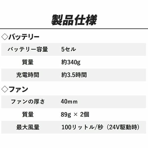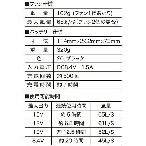 圧倒的に便利な洗える高風量106Lファンがついにクロダルマからも登場!! ■ファン(風量、連続稼働時間)弱:56L/s・約20時間、中:78L/s、約8.5時間、強:95L/s、約5時間、最強:106L/s、約8時間ファン質量(1個):88g■バッテリー出力弱:10V、中:14V、強:17V、最強:20V■充電式リチウムイオン電池(DC18.5V/3350mAh/61.97Wh)重量:約319g外形寸法:W75×D27×H115mm充電時間:約3.5時間充電回数:約500回定格入力:DC21V/1500mA