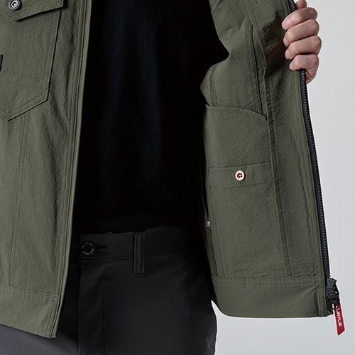 涼風が循環するオーバーフィットシルエット 胸ポケットのディテールを備えたあらゆるシーンに幅広く活用できるサイドファンウェア炎天下の身体を日光から守る裏チタン加工を搭載■サイドファン仕様ファンの位置が通常よりも脇に配置され重機の運転時にも邪魔にならない■立体風気路首裏の3Dの構造が風の通り道を確保し立体的な風気路が首筋を包み込み風が首筋を吹き抜ける■裏チタン加工遮熱効果 MAX-6.1℃
