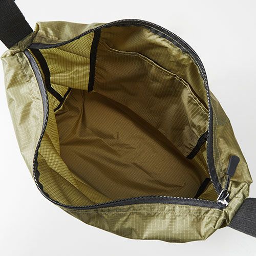 スポーツシーンでもシティーユースでもマルチに活躍間違いなし ナイロンのリップストップ生地でつくられた、軽量ショルダーバッグ。裏側にアクリルコーティングを施しているため、薄手ながらハリコシのある素材感はもちろん、耐久性にもすぐれたアイテム。袋口は防犯面でも安心なファスナー仕様。ショルダーテープの長さはアジャスターで調節可能なため、サイクリングやスケートボードなど、激しく動き回るスポーツシーンでも体にぴったりフィットさせて使うことができます。プレーンなデザイン&マチありで意外と大容量なので、さまざまなシーンでの活躍が期待できるバッグです。