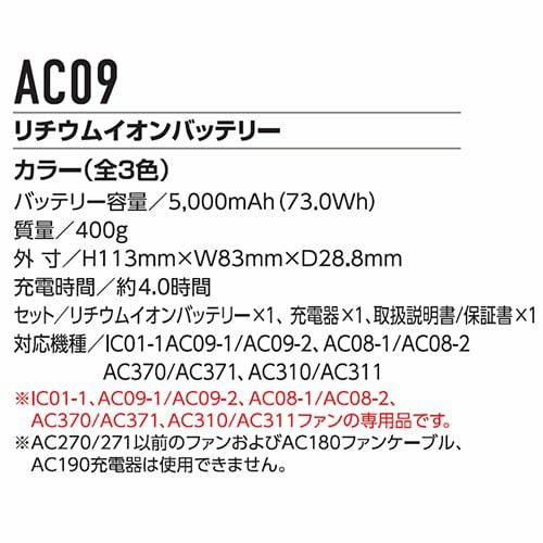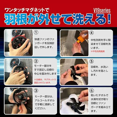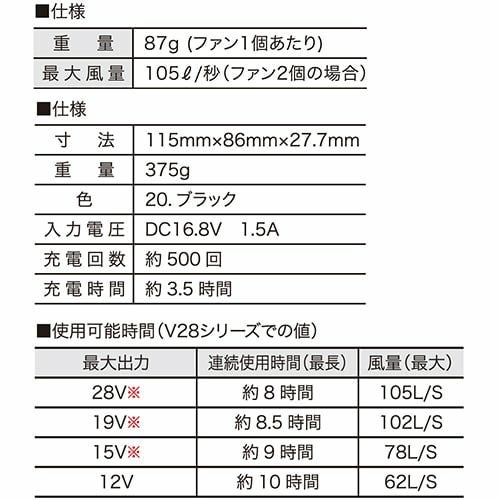 最強ファンバッテリー。最大電圧18V、最大風量106L/秒 ■赤色LEDを採用し屋外での視認性が向上■JIS IP55(防塵防水)規格適合(水没等の水の浸入による故障を保証するものではありません)■9段階のバッテリー残量表示機能付
