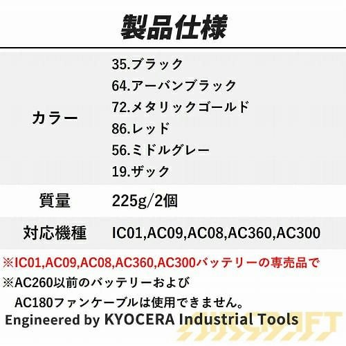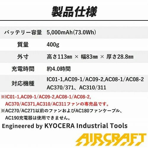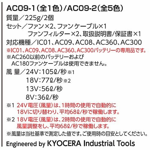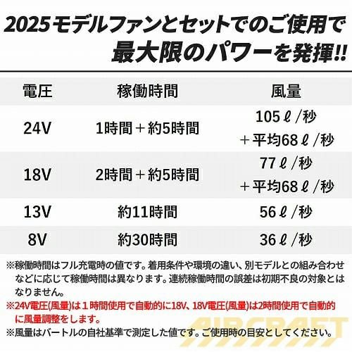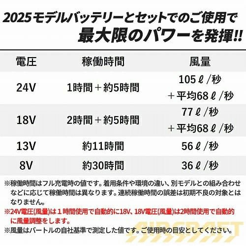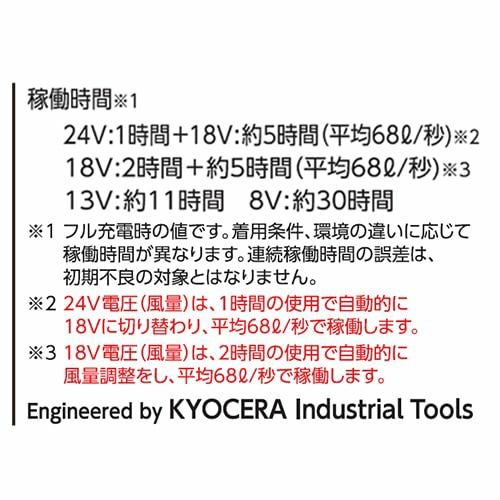 毎シーズンアップデートを続ける京セラIT社の24Vパワーバッテリーと防水ブラシレスモーターファンのハイスペックデバイスにより毎秒105リットルの最大風量を実現 最大毎秒105リットルの風量を発揮する24Vハイスペックバッテリー約4時間の急速充電にアップデートされたバッテリー水洗いに対応した防水設計仕様にアップデートされたファン最大毎秒105リットルの風量を発揮する耐久性に優れたブラシレスモーターファン