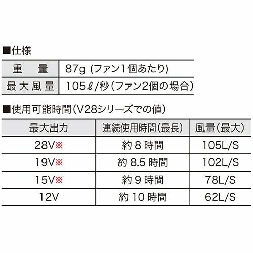快適ウェア用ファン(V28シリーズ) 羽根が外せて洗える!埃や臭いもスッキリ洗い落とせる!業界初!羽根の脱着をマグネット式に取付簡単!1日使えるタフバッテリー対応(12V作動時)10時間稼働!毎秒105リットルの風量を発揮する耐久性に優れたブラシレスモータファン!