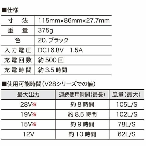 快適ウェア用バッテリー(V28シリーズ) 急速充電3.5時間対応!スマホも充電できるUSB出力付き!車のシガーソケットから充電対応(12V・24V対応)!1日使えるタフバッテリー(12V作動時)10時間稼働!の2025年快適ウェア用バッテリー