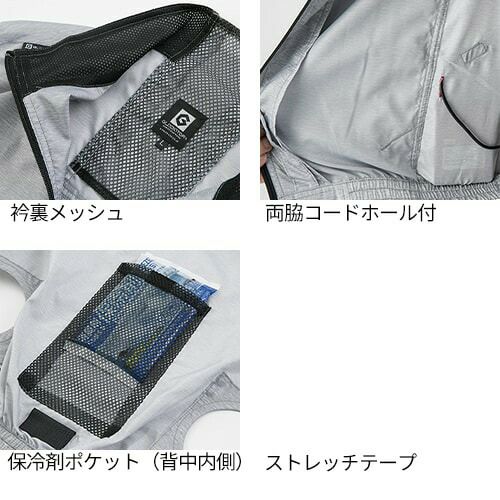 風が流れるシステム 電動ファン付きウェアと重ね着した際に■後身の腰メッシュ■背中の首下メッシュ■前身側の両脇下メッシュ3カ所のメッシュ切替から効率よくファンの涼しい風を直接Tシャツの中にまで取り込む画期的な構造。電動ファン付きウェアの特徴の気化熱冷感効果を最大限に発揮。
