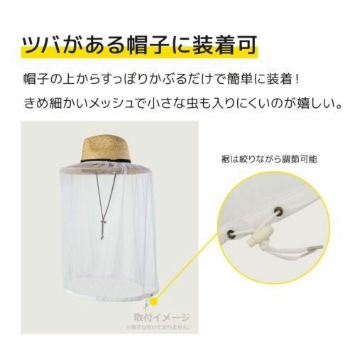 帽子の上からスッポリかぶるだけで虫から顔や首元を守る! きめの細かいメッシュで小さな虫も入りにくい!裾は絞りながら調節できます。