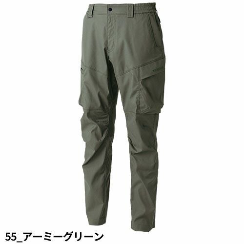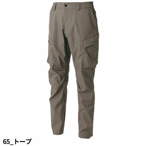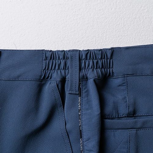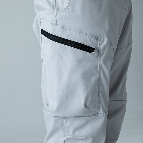 ナイロンによるしなやさを持つ高強度年間素材 ポリエステル×綿の混紡糸にナイロンのしなやかさと耐摩耗性をプラスしたハードな現場に対応できる高強度素材「TCNクロスツイル」使用ポリエステル糸、ナイロン糸ともにリサイクル原料を使用することで環境的な視点も併せ持つ。両脇ウエストゴム仕様と股下クロッチ仕様で立ちしゃがみや開脚などあらゆる動きをサポートする。カーゴパンツの右側はファスナーポケット、左側はフラップポケットとなっている。帯裏にはオリジナルの滑り止め付き。付属は金属製。