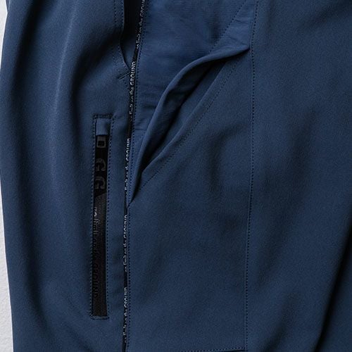ナイロンによるしなやさを持つ高強度年間素材 ポリエステル×綿の混紡糸にナイロンのしなやかさと耐摩耗性をプラスしたハードな現場に対応できる高強度素材「TCNクロスツイル」は、ポリエステル糸、ナイロン糸ともにリサイクル原料を使用することで環境的な視点も併せ持つ。左フラップポケットにはペン差しとネームホルダーループが付いている。左胸に縦ファスナーポケットを採用し、ハーネスを着用しても物が出し入れしやすいように考慮している。左袖マルチスリーブポケットは仕切りを設けることでマジックやペンなど落ちにくい設計。肘部分はダーツ仕様で腕の曲げ伸ばしがスムーズ。ファスナーが隠れる前立て仕様で、フロントファスナーにはオリジナル引き手が付いている。袖口と裾は調整ボタン付き。付属は金属製。
