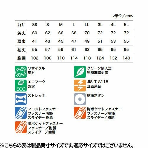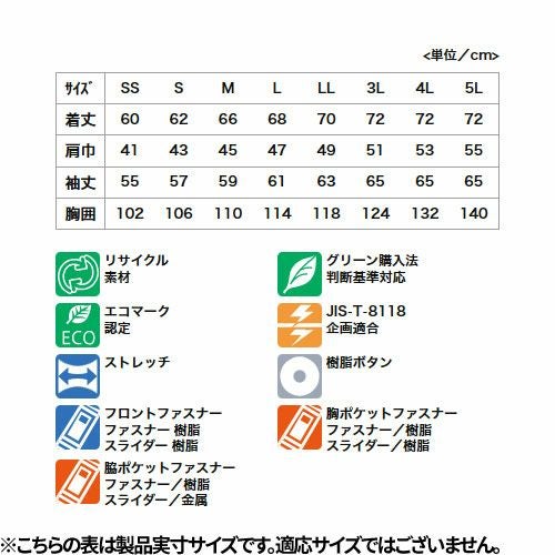 東レの植物由来合成繊維「エコディア」を使用した環境配慮型アイテム ・「軽い」「伸びる」「動きやすい」高機能ストレッチ素材 東レ「Lightfix」を使用・製品制電 JIS T-8118適合・環境負荷の少ないエコマーク認定(認定番号 24103010)、グリーン購入法適合品(作業服 基準適合)・多彩なコーディネートが可能・レディース対応も充実(ダイバーシティモデル)・多様なツールが携帯できる抜群の収納力を持ちつつ見た目はスタイリッシュ・アクティブ&シャープな印象の立ち衿仕様