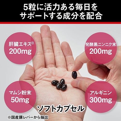 活力のある毎日をおくりたい方におすすめのサプリメント 国産豚レバーから抽出した肝臓エキスをはじめ、毎日の健康をサポートする発酵黒ニンニク、マムシ粉末の他、アルギニンを配合しました。体づくりに必要な亜鉛や3種のビタミンを加えました。