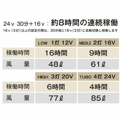 12V稼働で最長16時間連続使用可能!ロングドライブファンバッテリーセット! 最大毎秒85リットルの風量を発揮24Vを30分と16Vで約8時間の連続稼働が可能