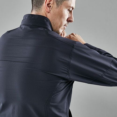 サラッとした肌触りが持続するドライタッチのメッシュ鹿の子が吸水性と伸縮性を高めるシンプルなルックスが魅力のハイエンドシリーズ ・Xラインデザインによるシャープなシルエット・ドライな着用感が持続する吸汗速乾加工・不快な汗のニオイを抑える消臭テープ付き・胸ポケット(ボタン止め)と袖マルチポケット付き