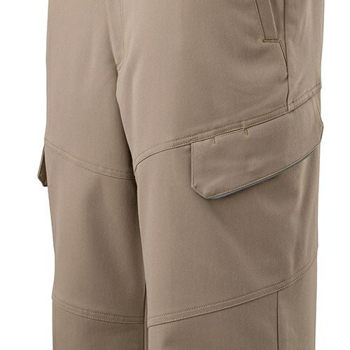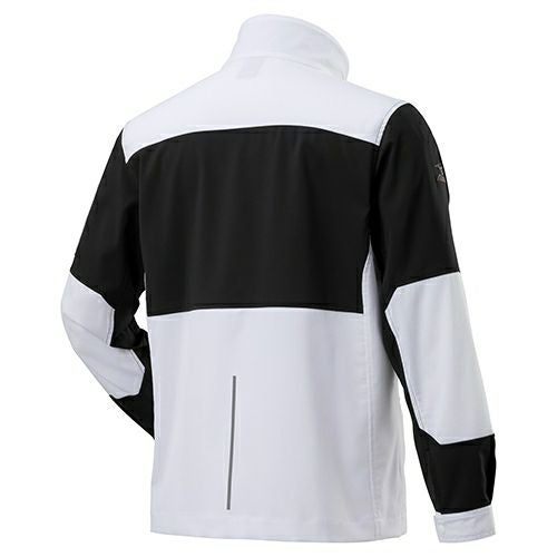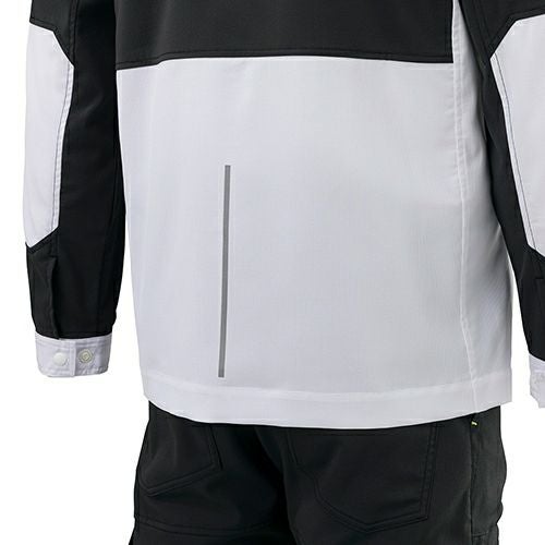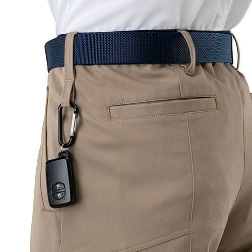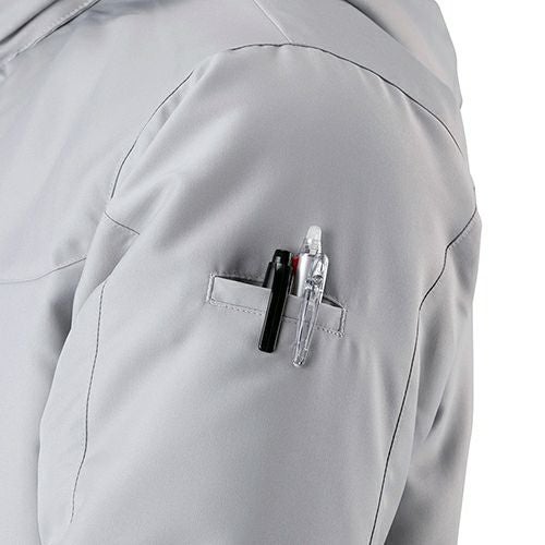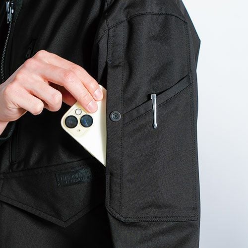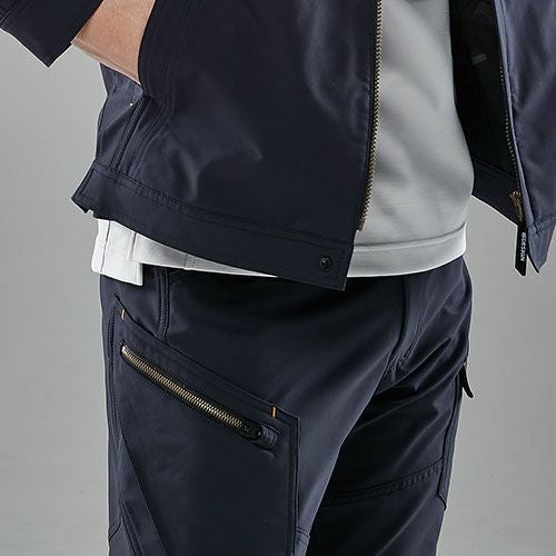 後腰部分にメッシュを施し後裾蒸れを軽減 ●しっかりした180g/m2の生地を使用●小物をいれるのに便利な左胸ポケット(寅壱オリジナルロゴネーム付き)●右袖口に反射ロゴネームつきで安全面にも配慮●脇下はトリカット仕様