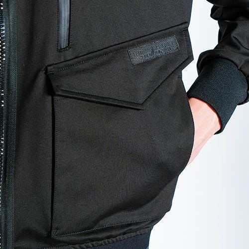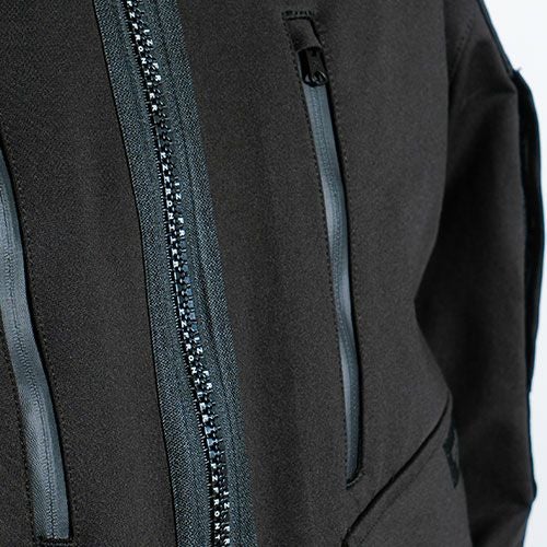 たどり着いた者こそが知り得るラグジュアリーな質感と情熱を包むマテリアル真髄を極めた最高峰フラッグシップモデル降臨 ●ニット素材でありながら考え得る限界まで布帛(織物)素材に近づけたハイスペックストレッチ素材を採用●30ゲージで高密度に編み込む事により従来のニット素材では成し得なかったハリコシ感を実現。優しい肌触りながらシャープでワイルドなスタイリングを可能とします。●素材裏面には微起毛加工を施しウォーム感漂う極上の肌触りを実現●快適性の高いニット素材の特性はそのままに適度なストレッチ性とキックバック性をプラス。布帛素材とは違うニット素材特有の着心地を実現します。●伸長率:タテ約9%・ヨコ約14%、伸長回復率(1時間後):タテ約88%・ヨコ約85%●抗ピリング性能4.5級、抗スナッグ性能4級、破裂強さ900kpaを誇る、ニット素材の中では屈強な生地強度も合わせ持ちます(ボトムスとして問題のない破裂強さの数値は400kpa)。●製品レベルでの寸法変化率は10回洗濯後でもタテ-2.3%、ヨコ0.2%を計測。従来のニット商品よりも高い寸法安定性を誇ります。●ラグジュアリー感溢れる光沢3Dラバープリントを効果的に施し、ジャケット裾ゴムにはロゴ入りジャガードを採用する等シンプルリッチな世界観を余すことなく表現。●業界初のエレメントレタリングプリントを施し高い先進性を演出する8番サイズビスロンファスナー、近未来感を表現する止水タイプポケットファスナー、国産YKK社製を使用したオリジナルドット釦等、細部にまで拘りを追求。