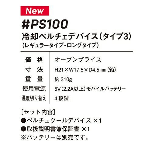 長時間使用による身体の慣れから危惧される冷感麻痺を回避する為にゆらぎモード(稼働10分・オフ2分の繰り返し)を搭載。新鮮な冷感を繰り返し体感すると共に連続稼働時間も30分アップ。 デバイス接触部位は電源を入れ約10秒で環境温度より最大マイナス約22℃のハイレベルな冷却機能を発揮。動脈を冷やす事により効果的に身体全体をクールダウンさせ、猛暑時の疲労軽減を促します。デバイス取り付け用キャップは新構造を採用し落下を軽減。デバイス形状は特許取得型で冷却温度のスペックアップを実現。