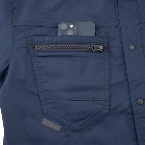 耐久ストレッチ素材でよりハードなワークシーンへ豊富な収納機能と新設計のEZラグランアームを採用し腕回りの動きやすさを実現 ■ワークシーンの定番、ポリエステルと綿の耐久ストレッチ素材■緯糸に特殊仮撚り技術による熱を加えるとバネのように伸縮性が生まれるクラボウ品質のバンジーテックサマーツイル■新設計のEZラグランアームで腕の動きをサポート、前後上下の動きに対し抜群の動きやすさとつっぱり感を軽減■ノーフォークと脇のメッシュベンチレーションが通気性を確保し衣服内の蒸れた空気を外に排出■豊富な収納ポケットと反射素材付き