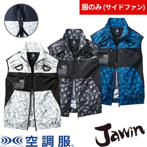 プリント柄が存在感際立つフルハーネス対応の空調服 収納可能なフックハンガーや背中部分からランヤードを取り出すことができ、個性的なプリント柄とJawinロゴプリントが特徴の空調服