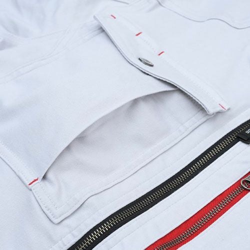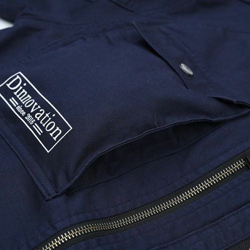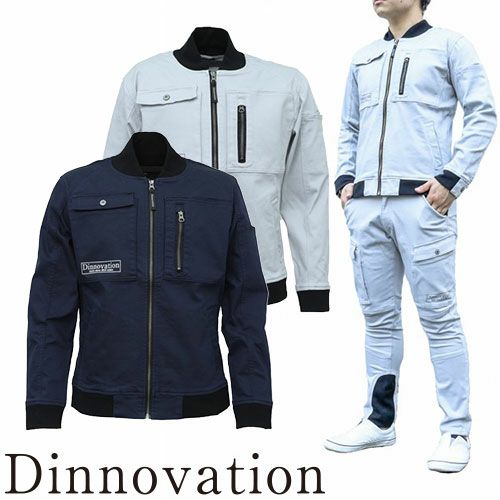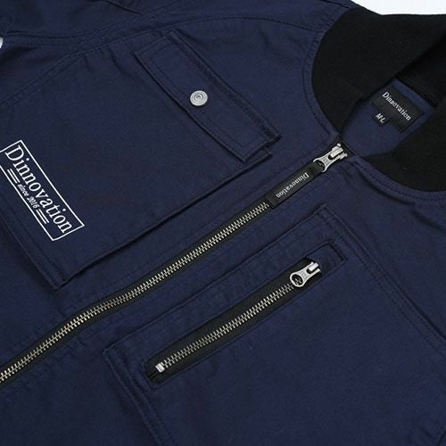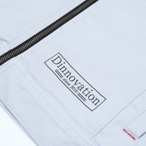 ・抜群の伸縮性を誇る中厚のカラーデニム素材でオールシーズン対応・ストレッチ性能抜群で、着用時のストレスを感じさせない「ストレスフリーカラーストレッチデニム」・スタイリッシュに着こなせるスリムシルエット・左腕にペン差し用ポケット・大型で便利なポケットを各所に配置。・左胸ポケットはフルハーネス対応の縦ファスナーポケット・右胸ポケットに「Dinnovation」ロゴプリント・ファスナースライダ―に「Dinnovation」ロゴプリント