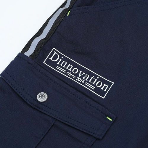 ・抜群の伸縮性を誇る中厚のカラーデニム素材でオールシーズン対応・ストレッチ性能抜群で、着用時のストレスを感じさせない「ストレスフリーカラーストレッチデニム」・ウエストにゴムベルトを採用し幅広いサイズ対応・反射素材をディティールに使用し視認性UP・スタイリッシュに着こなせ且つ柔軟性抜群なので動きが快適に・左ふとももには便利なファスナーポケット・ファスナースライダーには「Dinnovation」ロゴプリント・大型で便利なポケットを各所に配置・右ふともも部分に「Dinnovation」ロゴプリント
