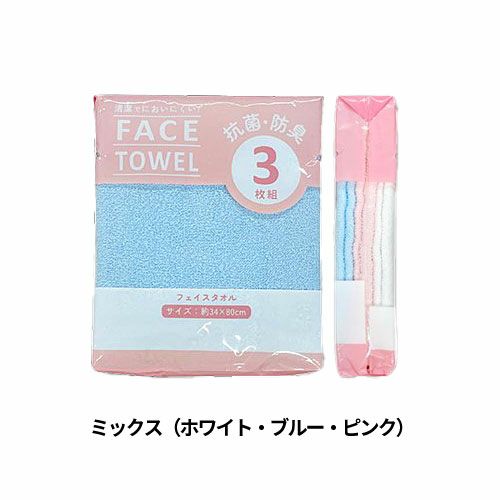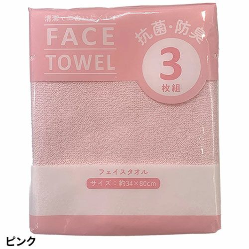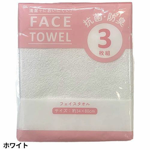 ●抗菌加工を施したフェイスタオル3枚入りの徳用パックタオルです。●薄手の生地はさっと使うのに丁度いい。洗いやすく絞りやすい、そして乾きやすいので手軽にご使用いただけます。