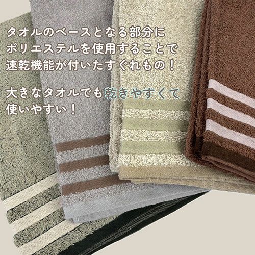 ●掛けてもよし、敷いてもよし。体をすっぽりと包み込めるサイズの超大判バスタオルです。●自宅や保育園でのお昼寝ケットとしてはもちろん、エステサロンや診療所など業務用途でも重宝されるサイズ感。●タオル地なので気軽にお洗濯ができ、汗が気になる暑い時期にもピッタリです。●深みのあるグリーン・ブラウン・ベージュ・グレーの4色展開です。●グラウンドにポリエステルを使用することで、速乾機能のある超大判バスタオルです。
