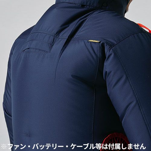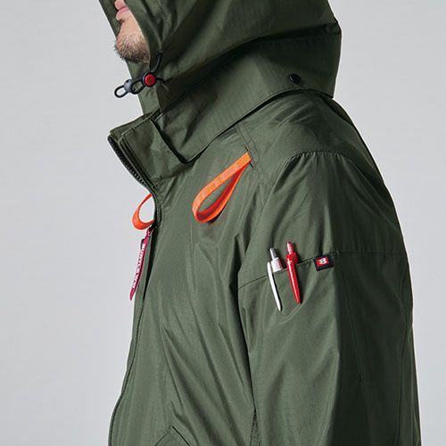 ギミックの効いたレッドファスナーポケットを施したハイバックファンモデルが様々なワークシーンでのパフォーマンス性をアップ ●様々なワークシーンで重宝するハイバックファン取付設計モデル●遮熱効果(-10度)に優れたアルミコーティング加工と軽量、冷感性を持つナイロンシェル素材●背ヨークに保冷剤(別売)を収納可能な通気エアダクトポケットを装備●ヘルメット収納フード(着脱可能)、フックハンガー、背ランヤードホールを配備しフルハーネスに完全対応●男性ユニセックスの着用に対応